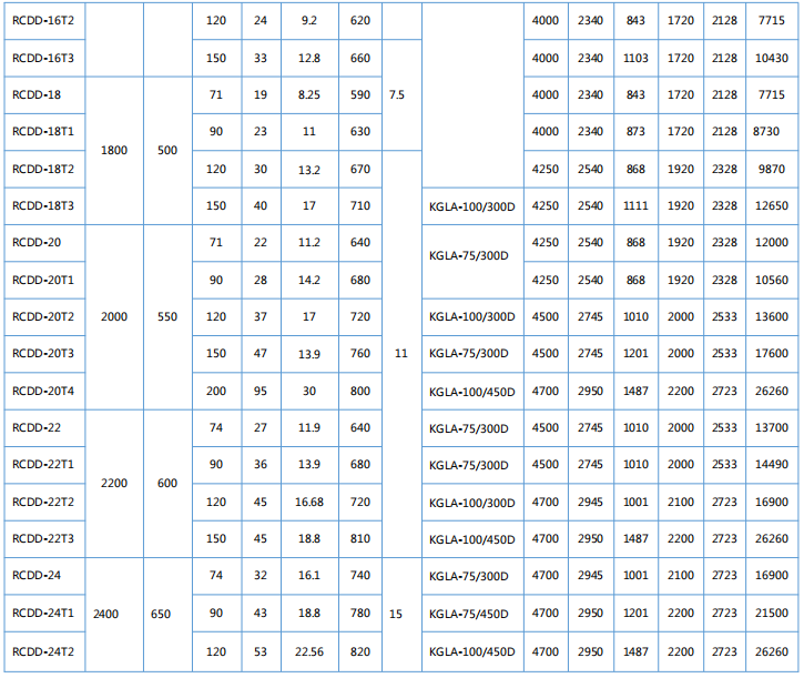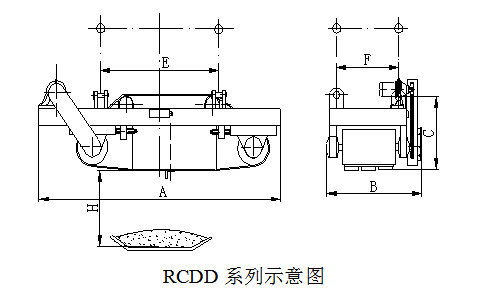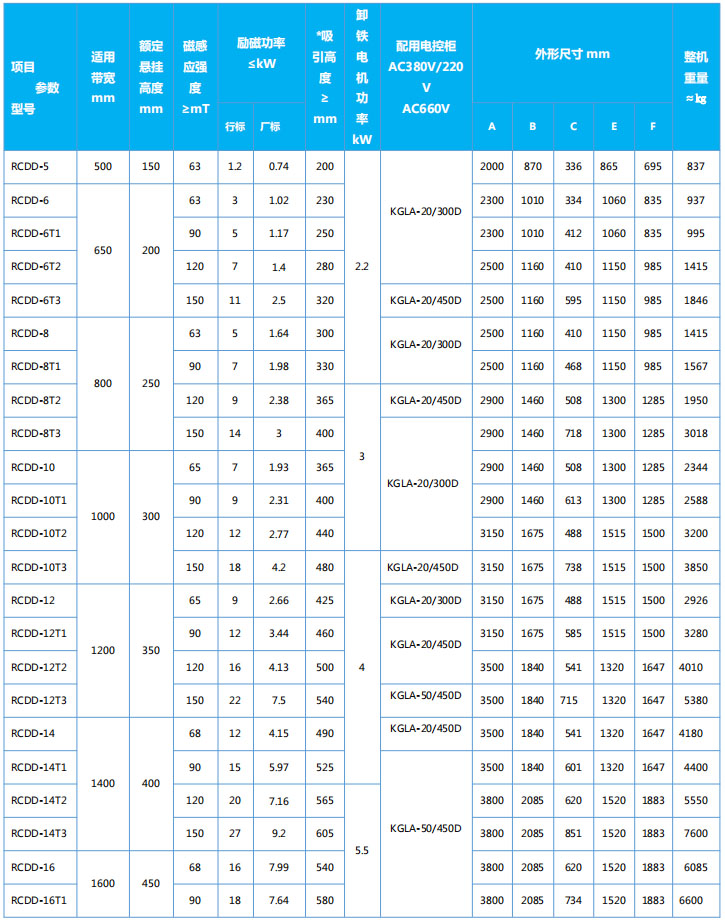 四、RCDD系列懸掛帶式自冷電磁除鐵器主要技術參數、外形尺寸             執行標準:JB/T7689