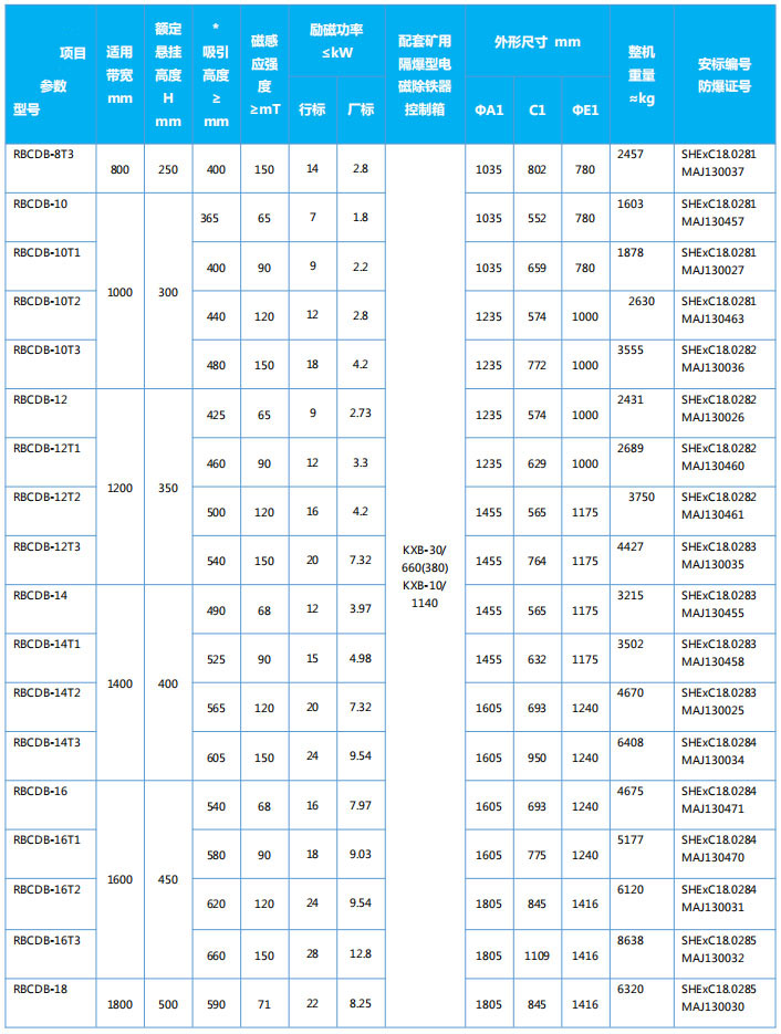 四、RBCDB系列隔爆型盤式電磁除鐵器主要技術參數、外形尺寸  執行標準:GB3836-2010、Q/321191ACL003