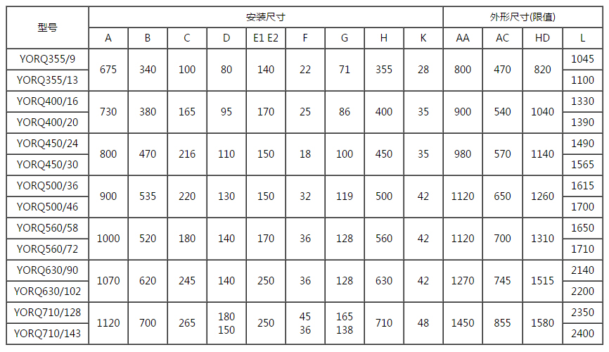 表1 YORQ短系列永磁耦合調(diào)速器外形及安裝尺寸表(機(jī)座號(hào)355~630)