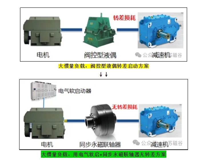 風(fēng)機(jī)水泵平方轉(zhuǎn)矩類用液力偶合器或渦流永磁調(diào)速器調(diào)速,電機(jī)功率1000kW,調(diào)速比i=80%,轉(zhuǎn)差損耗功率= (80%^2 - 80%^3)*1000 = 63.5kW;按年工作8000小時(shí),電費(fèi)0.6元/度計(jì)算,年耗電費(fèi)=63.5*8000*0.6=304800(元) 據(jù)估算,(1) 用于緩沖沖擊保護(hù)配套有阻尼類緩沖液力偶合器每年轉(zhuǎn)差損耗為478億千瓦時(shí);(2) 用于風(fēng)機(jī)、水泵負(fù)載轉(zhuǎn)差調(diào)速過(guò)程每年產(chǎn)生的轉(zhuǎn)差損耗為560億千瓦時(shí);合計(jì)轉(zhuǎn)差損耗478+560=1038億千瓦時(shí),占比2022年中國(guó)工業(yè)領(lǐng)域電機(jī)總用電量3.98萬(wàn)億千瓦時(shí)2.68%。相當(dāng)三峽發(fā)電全年的發(fā)電總量。 【解決緩沖轉(zhuǎn)差損耗策略1】 中小轉(zhuǎn)動(dòng)慣量負(fù)載優(yōu)先采用無(wú)轉(zhuǎn)差彈性緩沖方式啟動(dòng)和運(yùn)行。