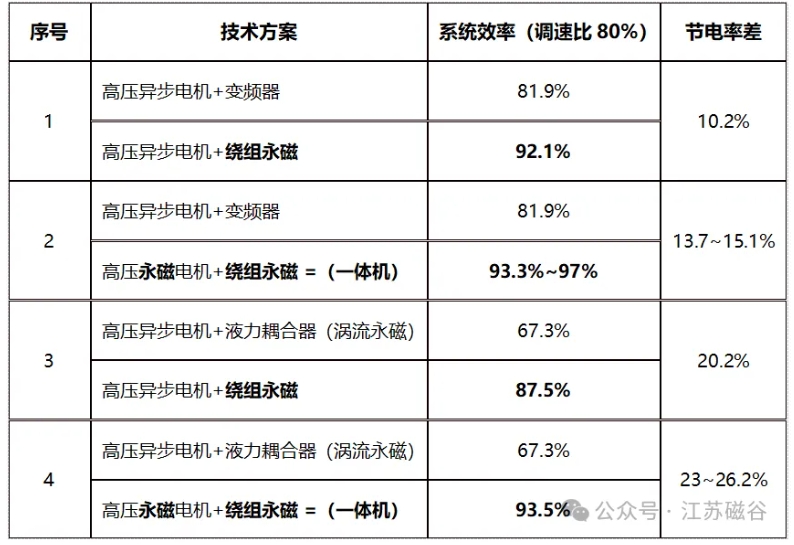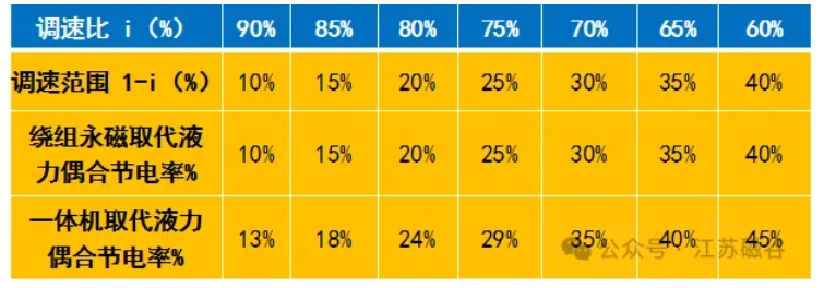 【繞組永磁調(diào)速高節(jié)電性能】 繞組永磁調(diào)速的原理就是將發(fā)熱轉(zhuǎn)差功率用永磁轉(zhuǎn)差發(fā)電技術(shù)來(lái)回收轉(zhuǎn)差能量。繞組永磁調(diào)速具有高節(jié)電性能:永磁一體就是將永磁電機(jī)和繞組永磁調(diào)速器嵌套集成的雙永磁調(diào)速電機(jī)。 1)繞組永磁調(diào)速同工況取代液力偶合調(diào)速器節(jié)電率見(jiàn)下表: